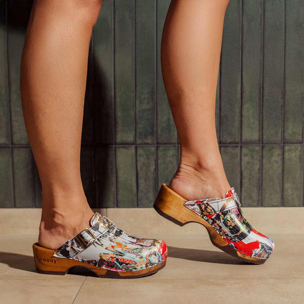 Der beliebte Damen Clog Manu ist schon seit Jahren einer unserer Bestseller und macht aus deinem Alltag Schritt für Schritt etwas Besonderes. Die stylischen Holzclogs bieten neben höchstem Tragekomfort auch ein einzigartiges Design. Manu Damen Clogs sind in mehreren modischen Farben erhältlich. Der Damen Clog Manu verfügt über einen praktischen Riemen mit einer bronzefarbigen Schnalle, mit dem sich der Schuh im Bereich des Spannes der Fußform anpassen lässt und so optimaler Halt gewährleistet wird. Als robuster Schuh für Alltag, Job und Freizeit fehlt es den Manu Damen Holzclogs dennoch nicht an einer großen Portion klassischem Charme, der diesen Clog vielfältig einsetzbar macht. Die ergonomische Holzsohle ist atmungsaktiv und fördert das natürliche Abrollen. Gehe besser – mit dem Holzschuh Modell Clog Manu aus dem Hause woody®!