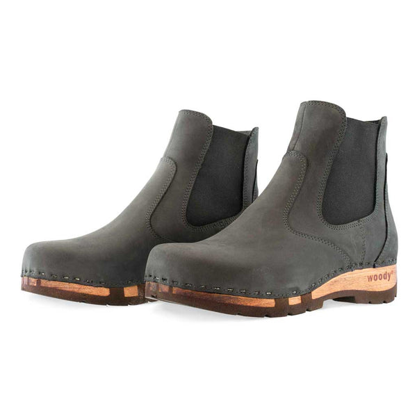 Ankle BootJutta with a 4.5 cm heel height. The wooden shoes with the flexible, bendable wooden sole and ergonomic wooden footbed - from woody shoes. Women's Clogankle boot Jutta combines wearing comfort with simple and elegant design. A shoe that goes with you through all the ups and downs of life and always keeps you cozy warm. Jutta can be easily slipped on and off in seconds thanks to the wide elastic band on the shaft. The flat and perfectly insulating wooden sole of the women's clogs offers solid support and a well-grounded feeling. Especially in the cooler months, this woody® shoe is the ideal companion for cooler days and long walks! The high-quality Italian leather gently embraces your feet – almost like a second skin. It gives your woody ankle boots a natural yet modern touch, a good fit, and provides noticeable as well as comfortable support. Enjoy comfortable, better walking with the ankle boot Jutta on the proven flexible wooden sole.