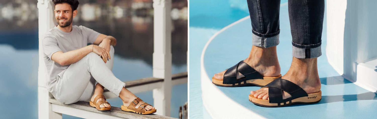 Our summery and airy woody® men's mules with the flexible wooden sole including ergonomic wooden footbed from shoesshoes at a glance. The classic mule design with flat sole (3 cm heel height). The high wearing comfort and healthy foot climate will convince you. Our shoe models score with maximum grip - as a slip-on shoe or as a model with buckles or Velcro fastener. The upper material - finest genuine leather, the lining made of high-quality calf leather lining.